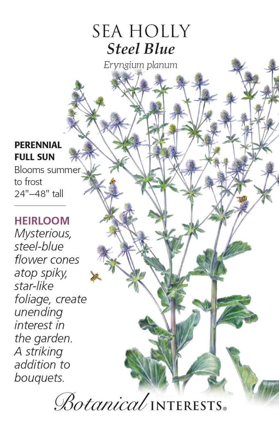 Sea holly brings extraordinary architectural beauty to the garden by day, and wonderment at night as it reflects the silvery moonlight. It blooms profusely through the summer, attracting pollinators and providing garden interest in winter with long-standing blooms. Cut flowers are captivating in fresh or dry arrangements. This tough plant thrives in poor soil, heat, and drought, and even tolerates salty soil as found in coastal areas. Perennial in USDA zones 5–9. Deer and rabbit resistant.