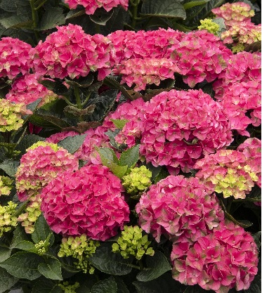 Long-lasting, sumptuous pink-red mophead blooms that are not influenced by soil pH. Flowers develop a lovely green tinge as they age. A compact, reblooming variety with lush dark green foliage, perfect for massing in the landscape or for use in containers. Superb cut flowers with notably sturdy stems. A new exclusive introduction for 2018. Deciduous.