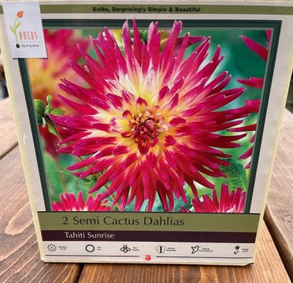 The Dahlia Semi Cactus Tahiti Sun produces flowers up to 5 inches across. Blooms mid to late summer and can reach 30 inches tall. Plant 2-4 inches deep and 12 inches apart.