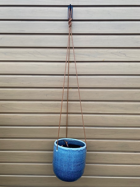The Skyline Hanging Planter is a 6.5-inch blue stoneware pot that can be suspended by its attached waxed rope.