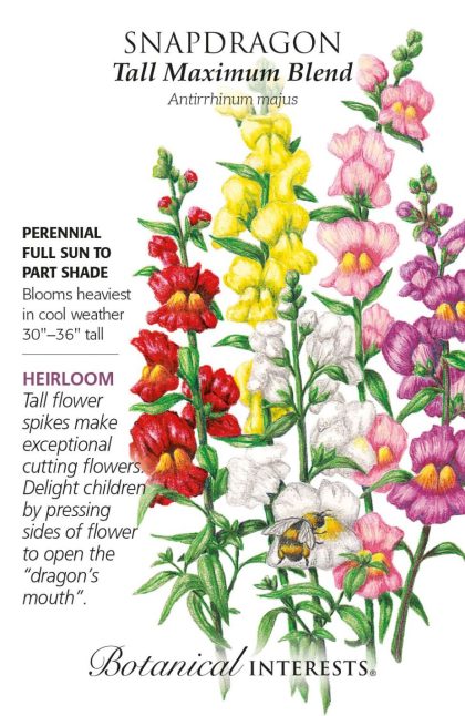 No garden should be without tall snapdragons. The beauty of this blend will add charm to your garden and your cut flower arrangements. A bee magnet, bumblebees climb into the “mouths” and sometimes are completely hidden! Breathtaking when planted in mass. Late afternoon shade is beneficial in hot summer areas.