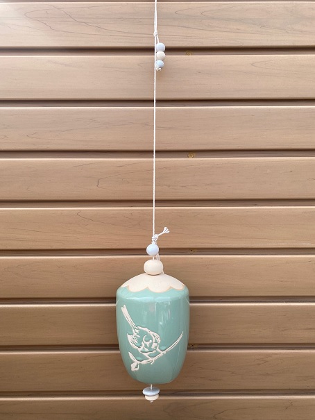 The Songbird Bell is green and features a design of a bird sitting upon a branch. It can be suspended from the attached cotton rope.