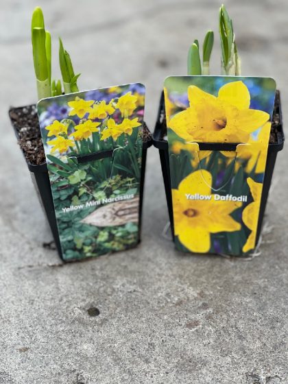 3.5″ potted & sprouting daffodil bulbs in assorted colors.
