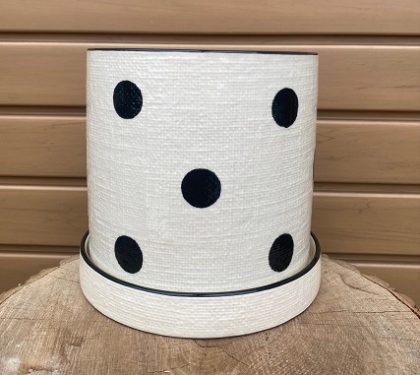 This stoneware planter is white with black dots and comes with a detached saucer. It measures 7 inches wide and 6.75 inches tall.
