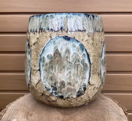 This multi-colored, glazed stoneware planter measures 9.25 inches wide by 9 inches tall.