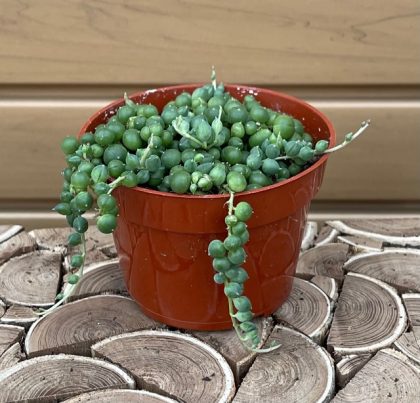 String of Pearls is a fun trailing succulent. This succulents like bright indirect light, sandy soil, and infrequent watering.