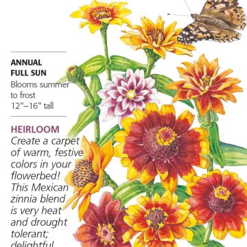 'Benary's Giant' blooms are truly giant at up to 6″, and come in a rainbow of eye-pleasing colors for an impressive backdrop in your garden. Blooms are densely petaled, very long-lasting, and hold up well despite rain and summer's heat. Flower beds come alive as butterflies and other pollinators come to visit these vibrant flowers. The Association of Specialty Cut Flower Growers named 'Benary's Giant' series their very first Cut Flower of the Year in 1999. Deer resistant.