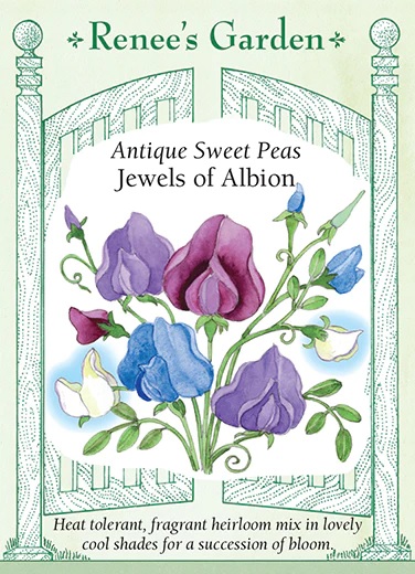 Our custom blended color palette of especially fragrant antique varieties offers both beautiful cool shades and plants with significantly more heat tolerance than other sweet pea varieties. You’ll have a succession in bloom with “Flora Norton” (pastel blue), “Lord Nelson” (deep blue), “Mrs. Collier” (creamy-white), “Lady Grisel Hamilton” (pastel lavender) and “Captain of the Blues” (mauve-blue). This lovely perfumed mix blooms on strong climbing vines that easily cover a trellis or fence.