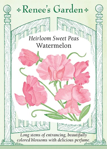 This lovely old variety, a true English Spencer sweet pea, combines graceful form, beautiful color and delicious subtle perfume. It’s difficult to do justice to their lovely color except to describe it as a shade in between fresh cut watermelon and ripe rosy peaches. These alluring flowers are borne on long stems on strong vigorous vines. When you gather a bouquet of these entrancing blossoms, they will make all your senses dance in delight!