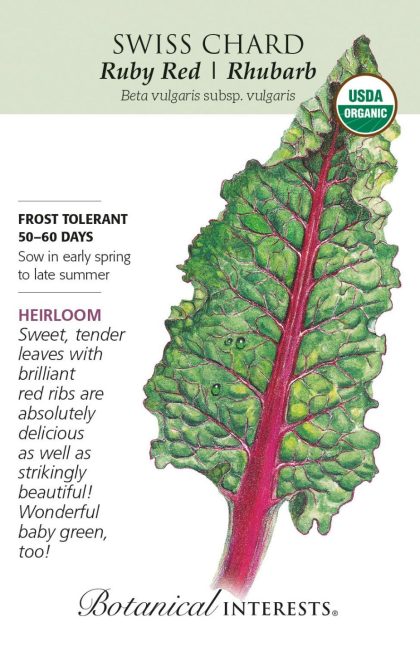 'Ruby Red' chard will beautify your garden as well as your plate! An 1850s vigorous grower with a long growing season, it will provide fresh greens from early summer into fall, and year-round in mild climates. Packed with vitamins and minerals, young leaves are great for salads. Any size leaves can be steamed, stir-fried, added to lasagna, omelets, soups, and stews, and mixed with other greens. Good container variety.