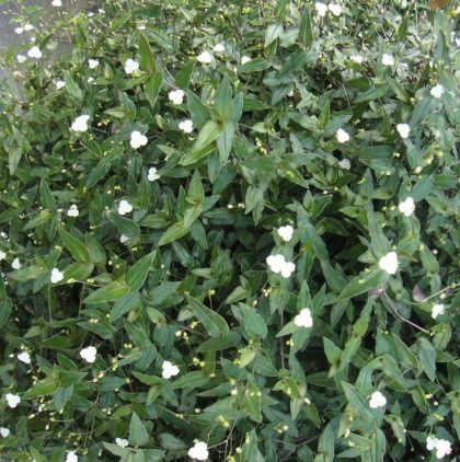 A vigorous spiller that thrives in warmth and humidity. Protect from direct sun. Tiny dark green foliage with purple backside are covered in dainty white flowers. A fantastic hanging basket for shade.