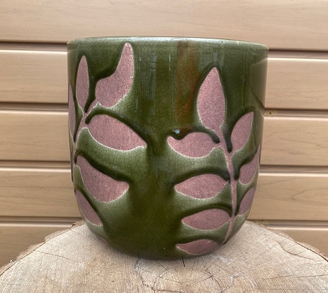 This green terracotta planter with debossed foliage print measures 7.25 inches wide by 7.25 inches tall.