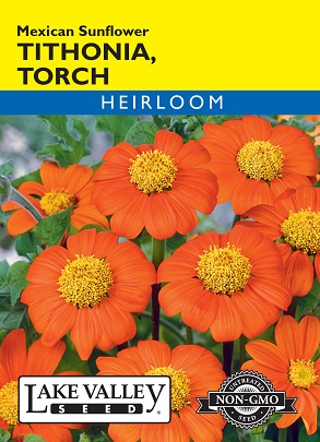 Butterflies will flock to tithonia’s bright orange blossoms. This tall, bushy plant is very drought and heat resistant and can grow into a thick hedge in a single season. Very easy to grow.