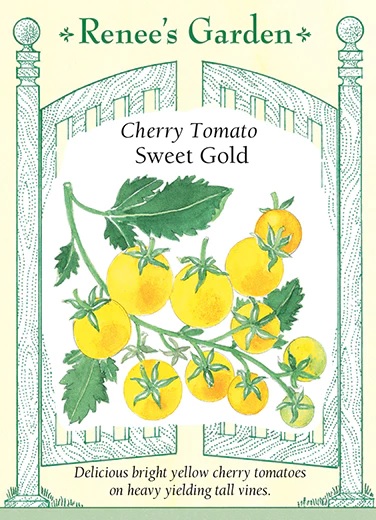 Most yellow cherry tomatoes are grown mainly for their color not taste, but Sweet Gold has both full, sweet tomato flavor and jewel toned golden yellow fruits. These glossy 1 inch cherries are delicious eaten right from the vine, enjoyed for snacks, or for adorning summer salads and stir fries. The vigorous indeterminate vines grow effortlessly, start bearing early and reliably produce heavy clusters of these brightly colored, tasty little fruits throughout the summer.