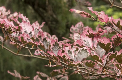 Striking foliage is purple with irregular creamy pink and rose-colored margins. A stunning specimen tree with an overall pink effect that will be a wonderful addition to the landscape. Not recommended for hot, dry areas. Deciduous.