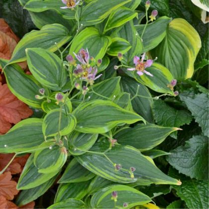 Also known as toad lily, this plant resembles a hosta with its large variegated foliage, displaying shades of deep green lined with yellow and light medium greens. The small, orchid like flowers are a pale violet toned white with freckles of dark purple all over and yellow in the center. They tend to flower in late summer to fall, are low maintenance, thrive in the shade and are resistant to deer.