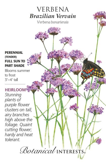 Rose-violet to lavender blooms at the tips of tall, strong stems create a light, airy wave of color through the flower bed. Very attractive to butterflies, bees and hummingbirds. Reseeds itself readily – a welcome volunteer! Also called tall or purple top verbena, purpletop vervain and South American Verbena.