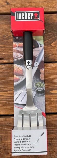 Weber Stainless Steel Spatula. Soft touch handle allows for a comfortable nonslip grip. Angled neck reaches over the grill to keep hands and arms away from heat. Wide front edge provides support when flipping food.