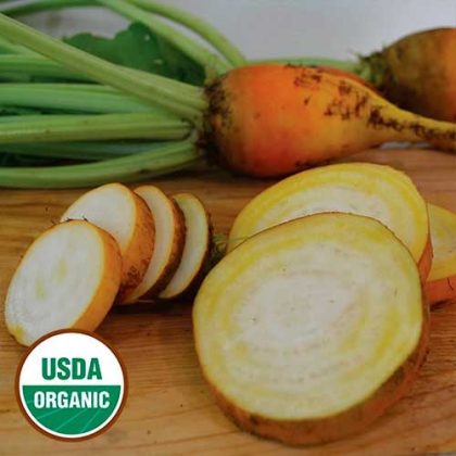 Winner of our 2015 beet evaluation for taste. White- and yellow-ringed roots measure 4-6½” long and vary in shape. While mangel and fodder beets are larger than typical beets and were traditionally used for animal feed, you’ll find the sweet, juicy, and smooth-textured roots are prime for the dinner table and not just the barnyard. Seed Savers Exchange’s seed stock was originally acquired from Dr. Alan Kapuler of Peace Seeds in the 1980s. 65-100 days.